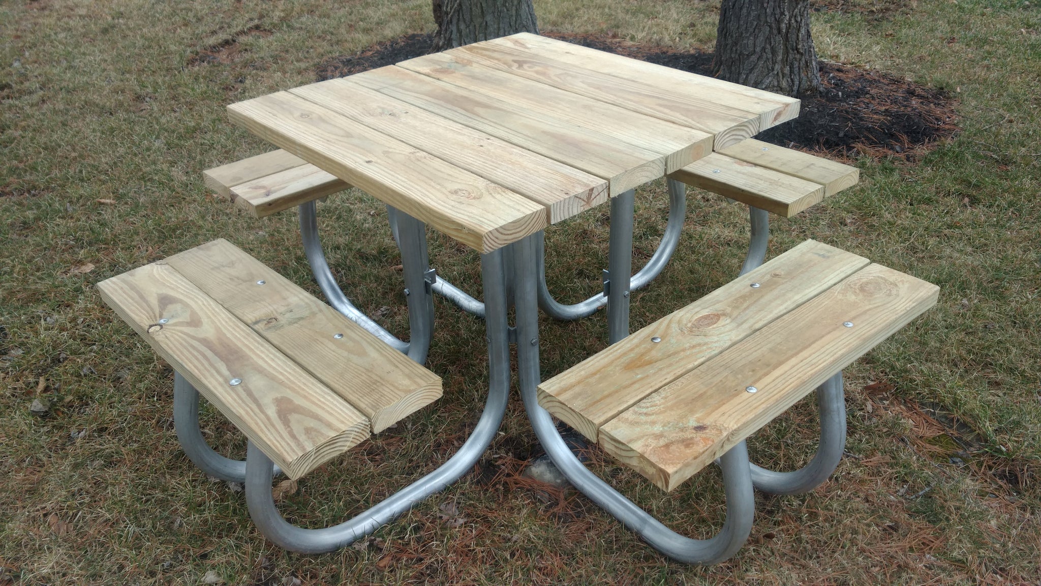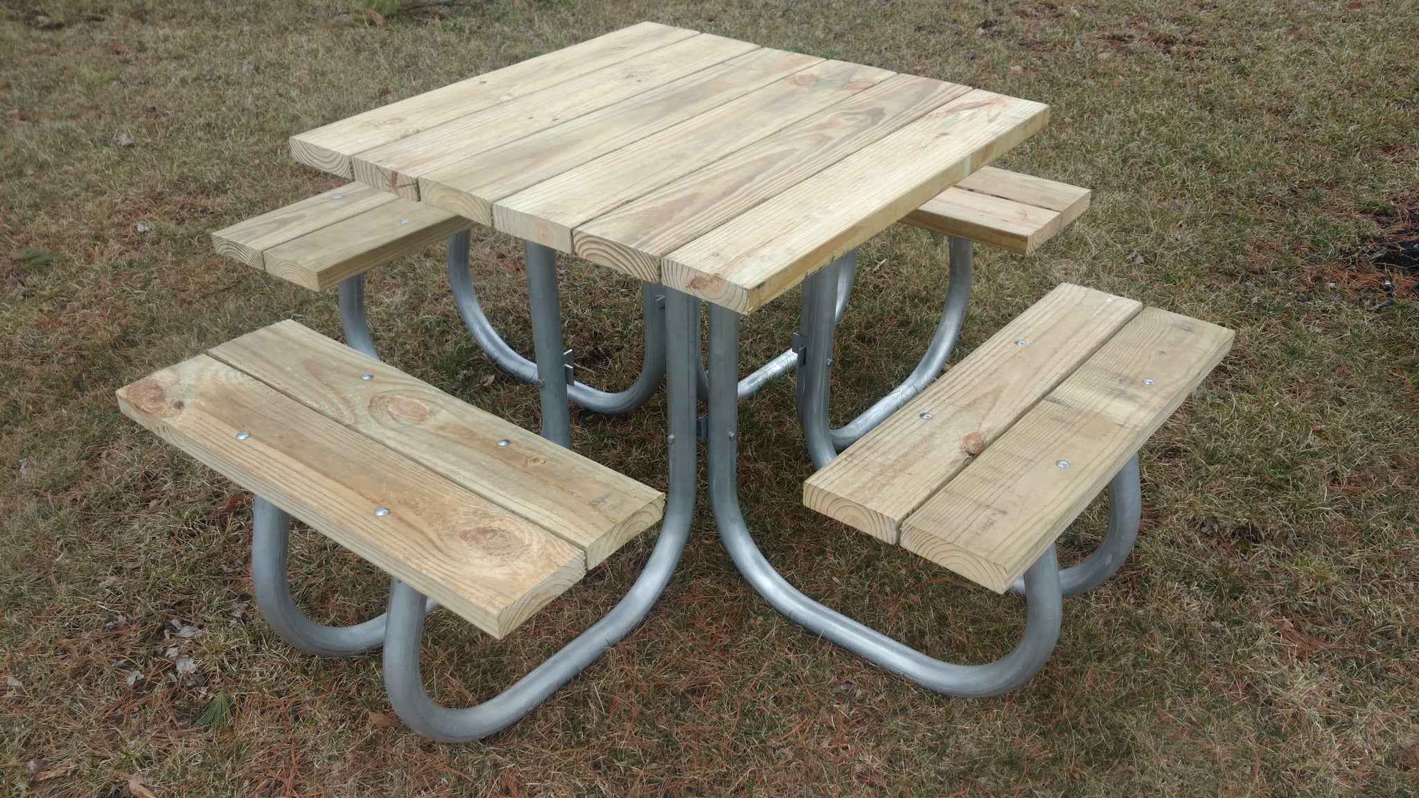 FREE SHIPPING) Aluminum Picnic Table Frame made out of 1.25" sch40 (1.7"od x 0.140" wall) aluminum pipe. With all stainless steel hardware included. All you need to purchase is lumber from your local lumber yard. The 34" square table top is designed for 34" long boards. And the 46" square table top is designed for 46" long boards. It's designed for 2"x 12" lumber or 2"x 6" lumber.Â